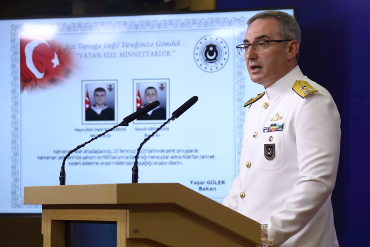 Milli Savunma Bakanlığı Sözcüsü Tuğamiral Zeki Aktürk tarafından gerçekleştirilen haftalık basın bilgilendirme toplantısında, geçtiğimiz günlerde şehit olan dört Mehmetçik için başsağlığında bulunuldu. Hava Savunma Üsteğmen Tuğrul Özsu, Topçu Uzman Çavuş Servet Ökkeş Çakır, Muhafız Er Hayrullah Halit Kahraman ve İkmal Er Semih Erdoğan’a Allah’tan rahmet dilendi.