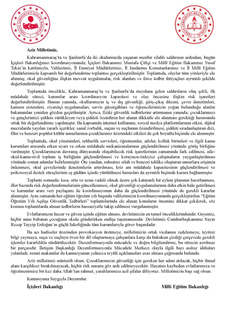 Yetkililer, olaylar üzerinden yapılan provokatif ve doğrulanmamış paylaşımlara karşı hukuki sürecin işletileceğini vurguladı. Vatandaşların yalnızca resmi açıklamalara itibar etmesi istendi. Açıklamanın sonunda hayatını kaybeden öğrenci ve öğretmene rahmet, yaralılara ise acil şifalar dilendi.