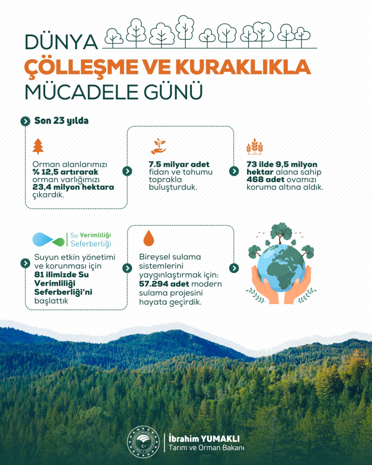 Tarım ve Orman Bakanı İbrahim Yumaklı, "Dünya Çölleşme ve Kuraklıkla Mücadele Günü" münasebetiyle sosyal medya hesabından bir paylaşım yaptı.