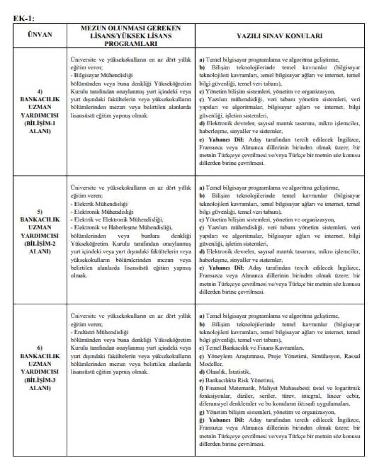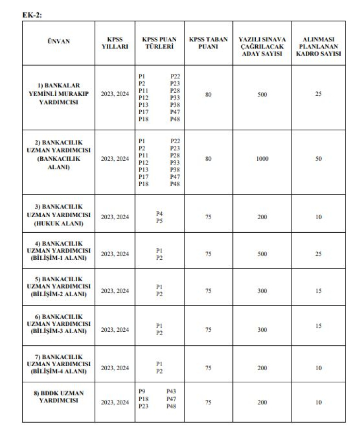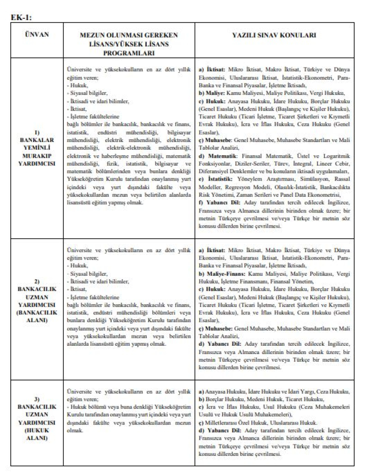 4) Bankacılık Uzman Yardımcısı (Hukuk Alanı) için 4 Eylül 2024 tarihi itibarıyla avukatlık ruhsatına sahip olmak. (Bu şartta belirtilen avukatlık ruhsatının aslı veya onaylı örneği, sözlü sınava katılmaya hak kazanan adaylar tarafından en geç sözlü sınav tarihinde Kuruma teslim edilecektir.)