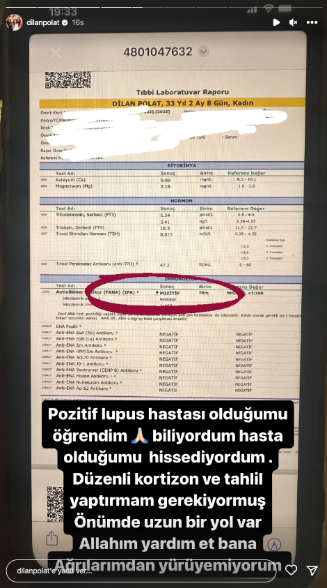 Laboratuvar raporunu sosyal medya hesabından paylaşan Dilan Polat "Önümde çok uzun yol var Allah'a emanet olun kendime odaklanmam lazım benim. Tedavi sürecine başlayacağım. Sadece bana dua edin. Sinir stres asla olmamalı diyorlar ama zaten beni bunlar hasta etti. Allah yar yardımcımız olsun. O kadar iyi biliyordum ki hasta olduğumu ağrılarımdan dolayı. Allah'a emanet olun" şeklinde takipçilerinden dua istedi.