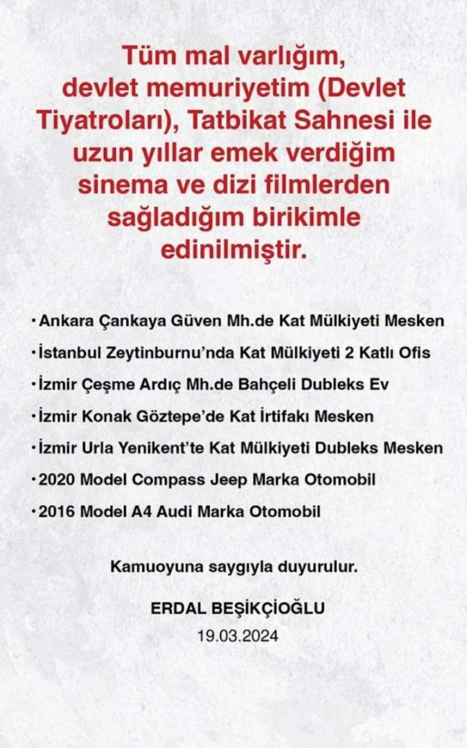 Erdal Beşikçioğlu, Instagram'dan yaptığı paylaşım ile mal varlığını duyurdu. Beşikçioğlu paylaşımında, "Tüm mal varlığım devlet memuriyetim (Devlet Tiyatroları), Tatbikat sahnesi ile uzun yıllar emek verdiğim sinema ve dizi filmlerden sağladığım birikimle edinilmiştir.