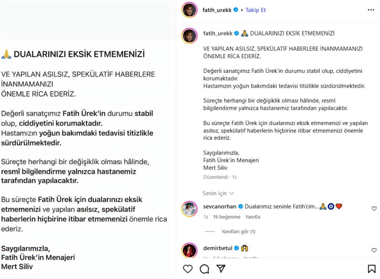 Fatih Ürek’in menajeri, sanatçının yoğun bakımda bulunduğunu ve tedavisinin büyük bir titizlikle sürdüğünü vurguladı. “Herhangi bir değişiklik olması durumunda, resmi bilgilendirmenin yalnızca hastane tarafından yapılacağını” belirtti.
