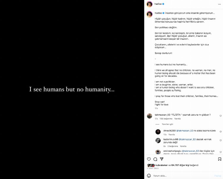 Ben politikacı değilim. Ben bir kadınım, kız kardeşim, bir anne babanın kızıyım, sanatçıyım. Ben hiçbir çocuğun, ailenin, insanın acı çekmemesini isteyen bir insanım. Çocuklarını, ailelerini ve evlerini kaybedenler için dua ediyorum… Savaşı durdurun!" (Ensonhaber)