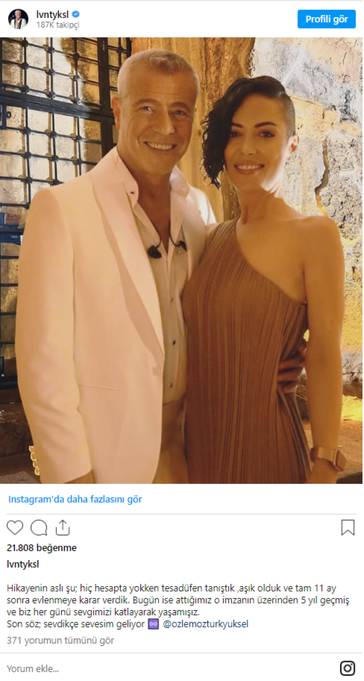 Levent Yüksel, eşiyle geçirdikleri 5 yılın ardından duygularını takipçileriyle paylaşarak evliliklerinin hikâyesine dair samimi ifadeler kullandı. Ünlü sanatçı paylaşımında şu sözlere yer verdi:
