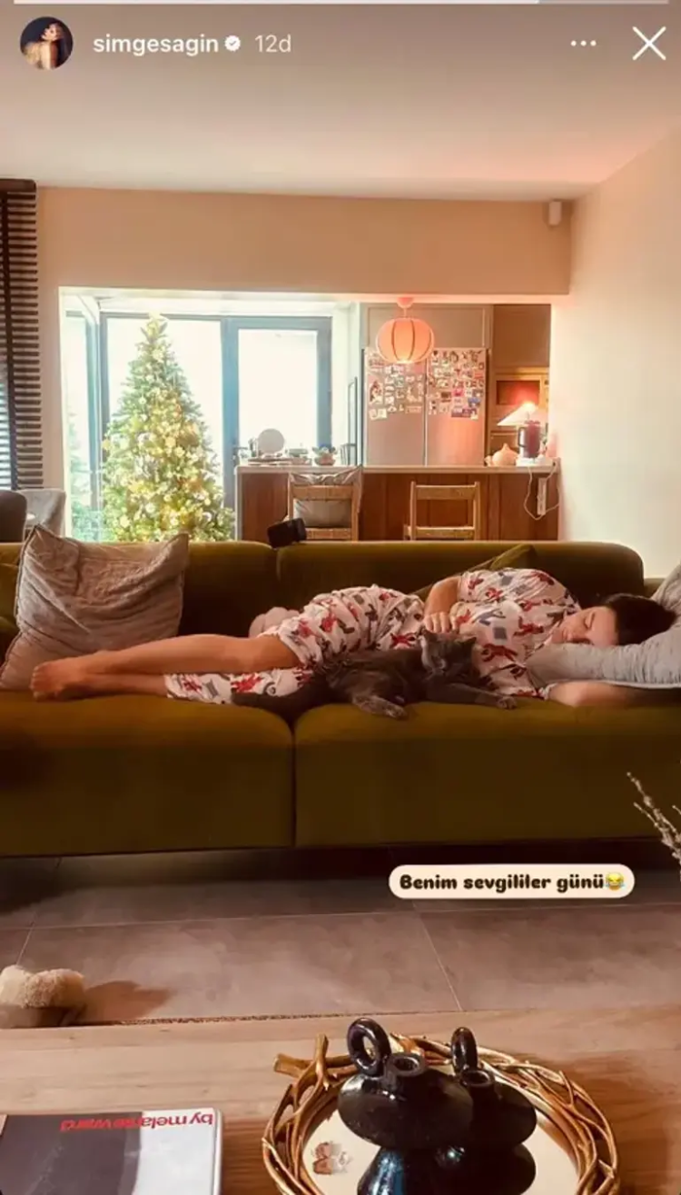 Instagram hesabından paylaştığı pozda, evinde kedisiyle birlikte olan Sağın, "Benim sevgililer günü" diyerek sevgisini minik dostuna gösterdi.