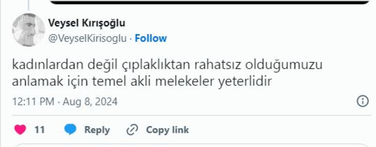 Kullanıcı, kadınların giyim tarzlarına yönelik yaptığı "Kadınlardan değil çıplaklardan rahatsız olduğumuzu anlamak için temel akli melekeler yeterlidir" şeklindeki ifadesiyle büyük tepki çekti.