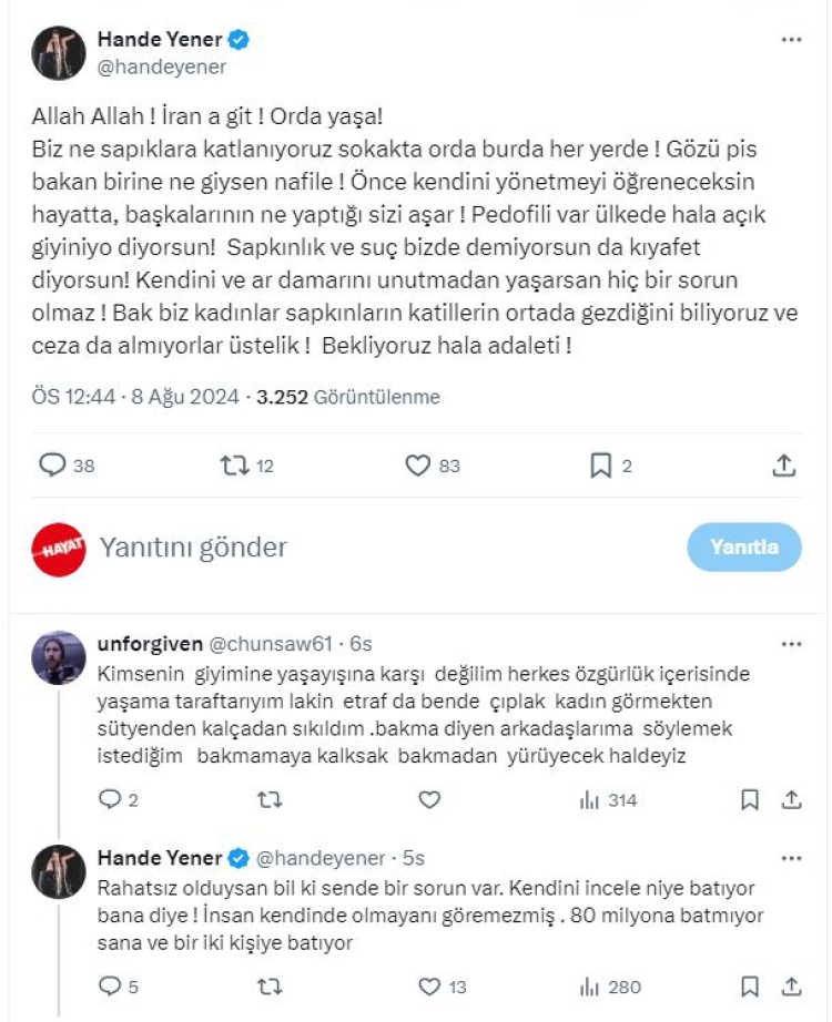 Yener'in bu açıklaması, sosyal medyada büyük yankı uyandırdı ve kadınların giyim özgürlüğü tartışmalarını yeniden alevlendirdi.