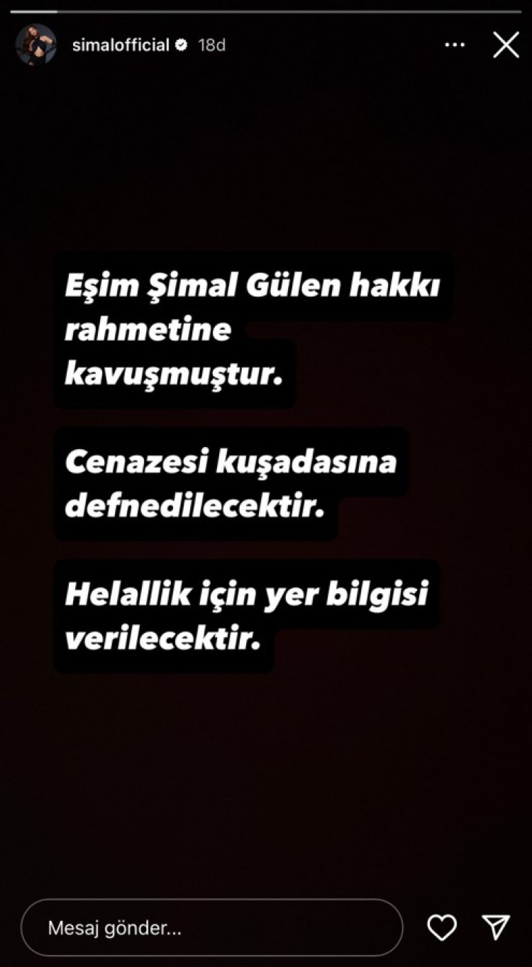 Ünlü şarkıcının eşi, Şimal'in yaşam mücadelesini kaybettiği haberini Instagram hesabından duyurdu ve şarkıcının Kuşadası'na defnedileceğini yazdı.