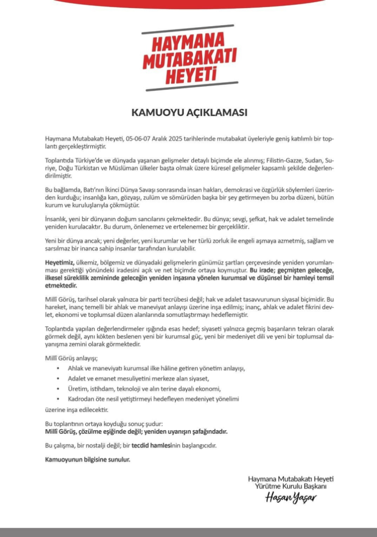 Saadet Partisi ve Yeniden Refah Partisi’nin ardından, Milli Görüş ideolojisine dayalı yeni bir siyasi parti için ilk sinyaller Haymana Mutabakatı Heyeti tarafından verilen sonuç bildirisiyle geldi. Heyet, Türkiye ve dünya gündemini değerlendirerek hareketin yeniden inşasını vurguladı.