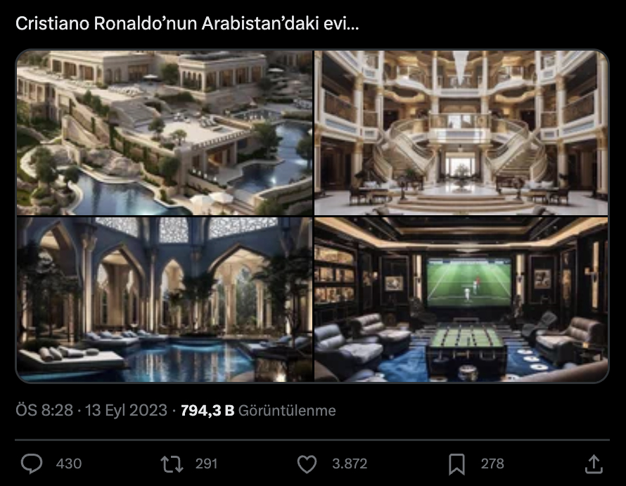 Ronaldo'nun evi iddiasıyla paylaşılan görseller programa yüklendikten sonra yapay zeka tarafından yapıldığı görüldü. Fakat görüntülerin kaynağına ulaşılamadı.