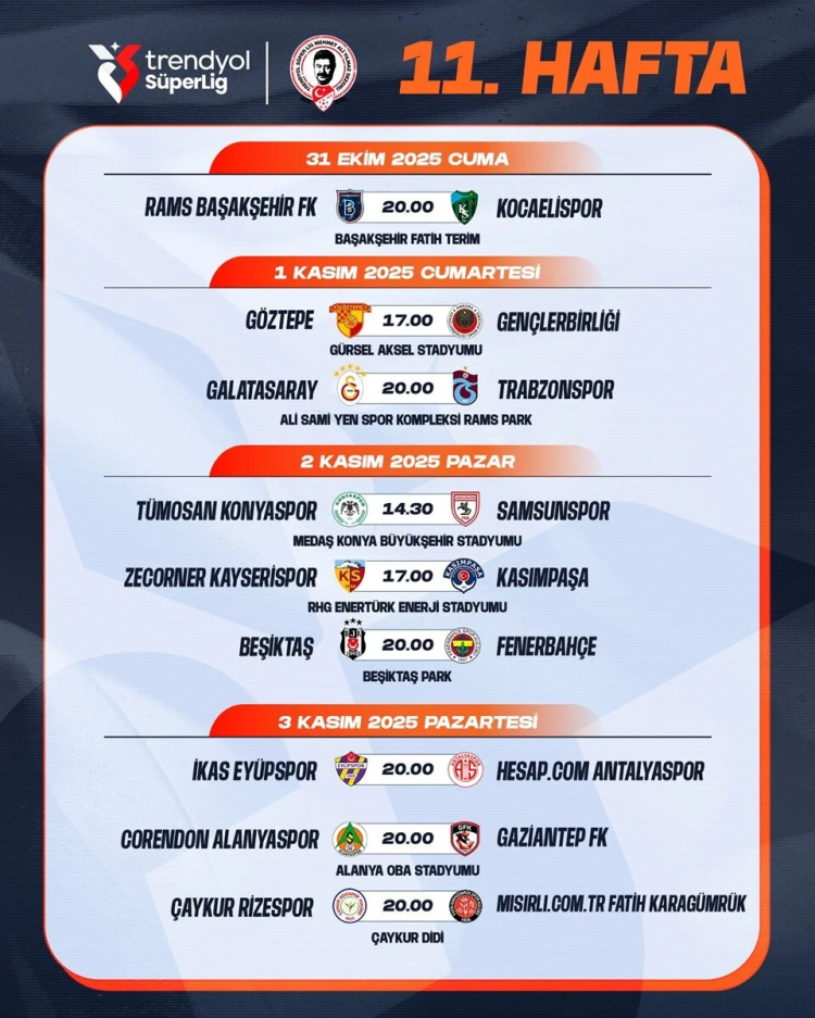 SÜPER LİG 11. HAFTA PROGRAMI