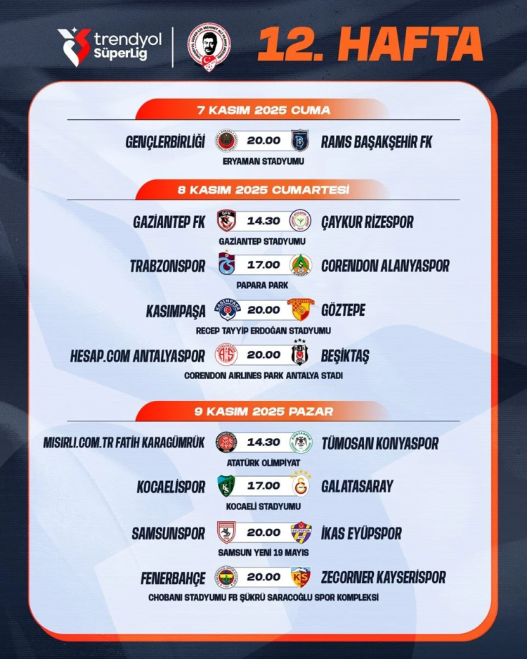 SÜPER LİG 12. HAFTA PROGRAMI