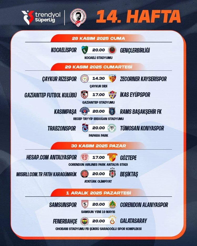 SÜPER LİG 14. HAFTA PROGRAMI