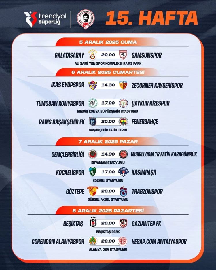 SÜPER LİG 15. HAFTA PROGRAMI