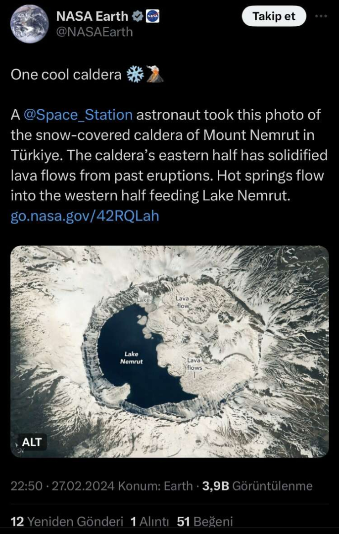 NASA’nın resmi X hesabından yayınlanan ve, “Harika bir kaldera Türkiye'deki Nemrut Dağı'nın karla kaplı kalderasının bu fotoğrafını bir @Space_Station astronotu çekti. Kalderanın doğu yarısı geçmiş patlamalardan kaynaklanan katılaşmış lav akıntılarına sahiptir. Nemrut Gölü'nü besleyen kaplıcalar batı yarısına akıyor” notuyla paylaşılan fotoğraf büyük beğeni aldı.