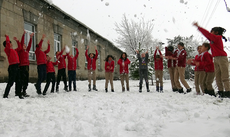 Kar yağışına sevinen çocuklar da okul bahçesinde kardan adam yaptı, kar topu oynadı.