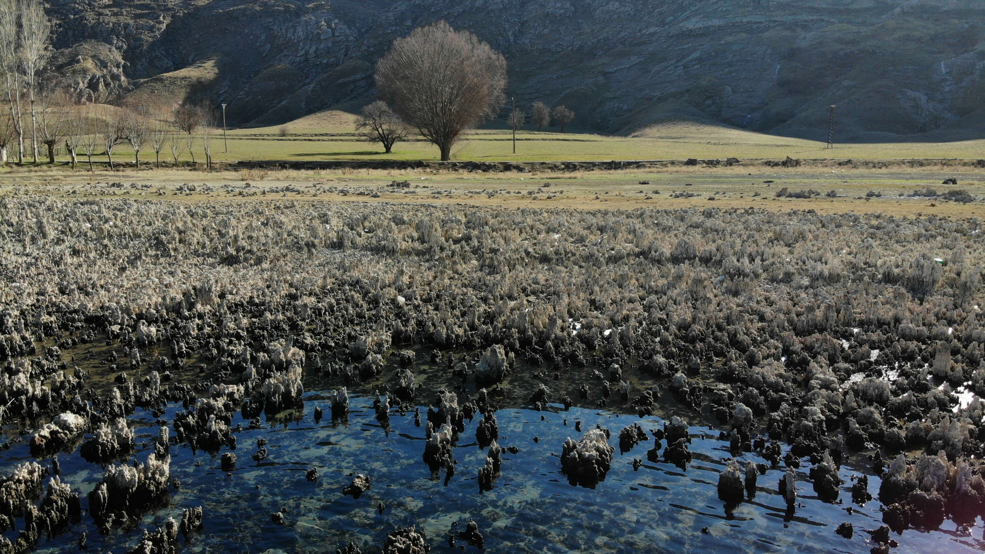 Van Gölü’nde su çekilmesi sonrası "su altı peribacaları" olarak nitelendirilen mikrobiyalit tarlaları oluştu.