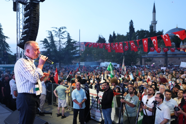 “Az önce arkadaşlarımızın ekrana yansıttığı bir video vardı. Orada benim buradan gördüğüm çocuklarımıza benzer çocuklar vardı. Babaların omuzlarında oturuyor şimdi çocuklar. Ama oradaki çocukların gözlerinde o korkuyu ve travmayı gördünüz değil mi? O çocuklar gözleri korku ile yerinden çıkmış çocuklar. O masum çocukların acısını hissetmeniz için sadece bir an kendi evlatlarınız olduğunu düşünün. Birçoğunuz yanınızda eşleriniz ile çocuklarınız ile gelmiş, kız kardeşleri ile anne ve babası ile gelmiş. Analarınızın, bacılarınızın başlarına bombalar yağdığını düşünün bir an. Aşağı yukarı Gazze’nin nüfusu Kocaeli’den biraz fazladır. Kocaeli’deki tüm insanların başına bombalar yağdığını düşünün. Ateş düştüğü yeri yakar ama o insanların düştüğü hali bir düşünün ve sadece hissedin. Bunun için Müslüman olmaya da gerek yok sadece yürek taşımaya gerek var. İnsan olmaya ihtiyaç var. Çünkü bunu sadece hayvandan daha aşağı olanlar hissedemez. Az önceki gösterilen diğer bir videoda Avrupa Parlamentosunda katıldığımız bir toplantıdan bir görüntüydü. Orada Ukrayna’daki çocuklar ve kadınlar için bir şeyler yapalım, Rusların zulmüne karşı ses çıkaralım, bu yaptırımlar az geliyor daha fazlasını yapalım diyorlardı. Söz istedim ve dedim ki; evet yapalım. Dünyanın neresinde olursa olsun. Zulme uğrayan kim olursa olsun masum çocuklar, kadınlar, eli silah tutmayan masum erkekler, bunların hepsi koruma altında olmalıdır. Zalimler kime zulmediyorsa nerede bir savaş suçu işleniyorsa ki Gazze’de olan asla bir savaş değildir. Orada adı devlet olan bir terör devletinin saldırısı ve terör eylemi vardır. Orada bir soykırım vardır”