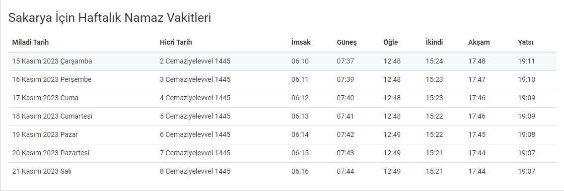 SAKARYA NAMAZ VAKİTLERİ 2023 HAFTALIK TABLO: