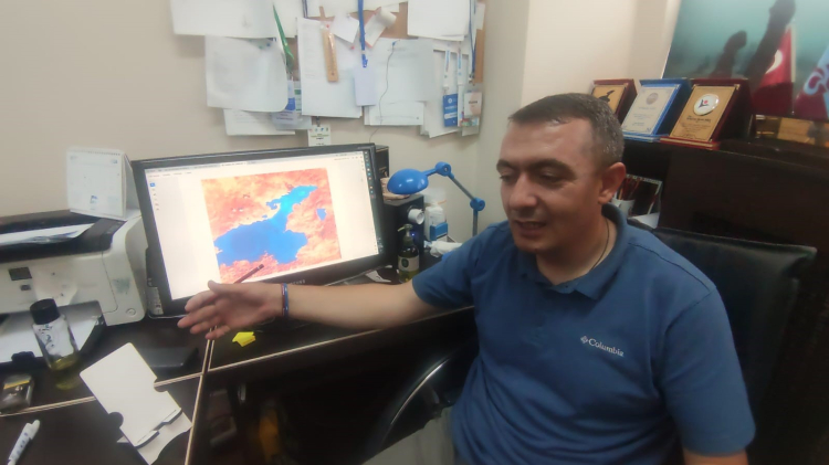 İnsanların öyle rasgele her yerde göle girmesinin maalesef kötü sonuçları ortaya çıkartabildiğinin altını çizen Dr. Öğretim Üyesi Mustafa Akkuş, “Bugün Van Gölü’ne girebileceğimiz cankurtaran ve bütün imkanları olan maalesef plaj sayısı çok yetersiz, çok az sayıda. Van Gölü’nün yüzme açısından diğer tehlikesi de şu. Buradaki gördüğümüz şu andaki görüntü Van Gölü’nün derinlik haritasını gösteriyor. Derinliklerin nasıl değiştiğini burada görüyoruz. Burada gördüğümüz yer Çarpanak Adası, yanıbaşındaki yarım ada şeklindeki Çarpanak burnu. Zaten akıntıların merkezinde olan bir yer. Bir akıntı böyle geliyor, bir akıntı ise Erciş tarafından geliyor. Dolayısıyla su hareketliliği fazla. Buna ek olarak ta burada derinlik aniden çok fazla artıyor. Kıyıdan suya hemen girdiğiniz zaman su derinliği 1 metre iken bir iki adım attığınızda 13 metre, 18 metre 40 metre ve 175 metre metreyi görüyorsunuz. Hele de yüzme bilmiyorsanız paniklememiz çok doğal. Bu sebepten dolayı Van Gölü çevresinde cankurtaranı olan, gözetleme kuleleri olan yerlerin sayısının artırılması lazım” dedi.