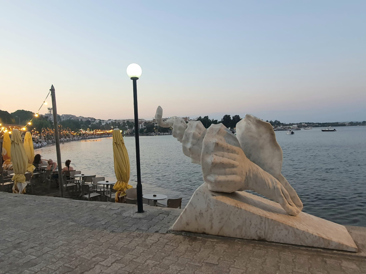 İki arkadaş geçirdikleri günü ve iş yerindeki yaşanılanları değerlendirme yaparak sahile doğru ilerler. Ayşe ilk defa gördüğü sahili incelemek isterken, Duygu anlattıklarının duygusuna kapılıp, hiç bir detayı fark etmez. Her zaman gittikleri gece yarılarına kadar oturdukları çay bahçesi artık yoktur. İçeride çoğunlukla 20 yaş altı erkek çocukları, oyun konsolları, tek kişilik koltuklar ve ekranlar gözüküyordur. Hepsinin kulağında kocaman kulaklık kimse birbiriyle iletişim kurmuyor, dışarıdan gelen sesleri de duymuyorlardır. Ayşe’ye ballandıra ballandıra anlattığı yerin önünden fark etmeden ilerlemişlerdir. Ayşe ise yürürken Arnavut kaldırımların bütün sahil boyunca devam ettiğini görür. Ne kadar doğal bir yol ve orijinal duruyor diye düşünür. Duygu hissettiklerinden çıkamamış ağlamaklı bir sesle Ayşe’ye seslenir. Ayşe ise sanki kulaklarını Duyguya kapamış sadece duymak istediklerine kulak veriyordur. Denizin kumsala hafifçe dokunup çıkardığı o muazzam sese ve balkonlardan gelen çatal bıçak seslerine. Ayşe sadece bu seslere duymaya izin vermiştir kendine.
