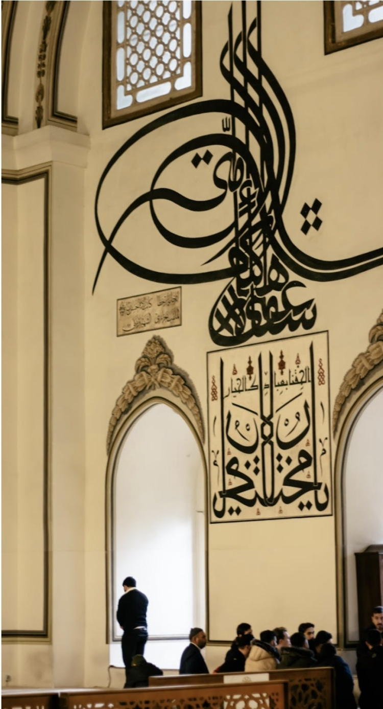 Ayet ve hadislerin vermek istediği mesaj muazzam. En çok etkilendiğim hadisle başlamak istiyorum. Minberin üzerindeki hadiste: “Mümin camide sudaki balık gibidir, münafık ise camide kafesteki kuş gibidir.” Her birimiz deryada yüzen balıklar gibiyiz bu Ulu mabette; farklı kıyılardaki zenginlikleri görmeye çalışıyoruz. Her kıyı, her köşe kendine has yazılarla süslenmiş. Kapının üzerinde kuşatmayla ilgili ayet bulunmakta, şadırvanın etrafında cennette bulunan ırmaklardan bahsedilmektedir. Adalet ile ilgili ayetler, dönemin kadıları ve yetkili kişilerinin namaza durduğu yerde yazmaktadır. Camideki ayetlerin ve hadislerin manaları, ulaşması gereken kişilere ya da bağ kurulacaklara hatırlatma yapacak şekilde özenle seçilmiştir. Sütunları gezerken sanki sayfa sayfa kitap okuyormuş hissi de veriyor gibi.