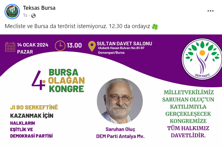 Bursaspor taraftar grubu Teksas sosyal medya hesabından, yarın DEM Antalya Milletvekili Saruhan Oluç’un katılımıyla gerçekleşecek kongreye işaret ederek şu paylaşımda bulundu: